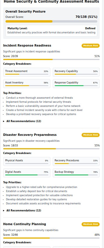 As our homes become increasingly connected through smart devices, IoT sensors, and automated systems, the need for structured security and continuity planning has never been greater. What was once reserved for Fortune 500 companies is now essential for protecting your family, property, and digital life. Our Smart Home Security & Continuity Assessment adapts proven enterprise frameworks to create a comprehensive protection strategy for your connected household.