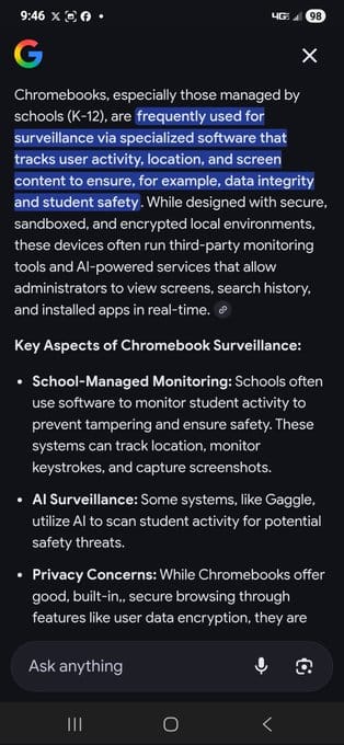 "Students have no expectation of confidentiality or privacy with respect to any usage of a Chromebook, regardless of whether that use is for school-related or personal purposes." — Actual language from a 2025–2026 school district Chromebook policy